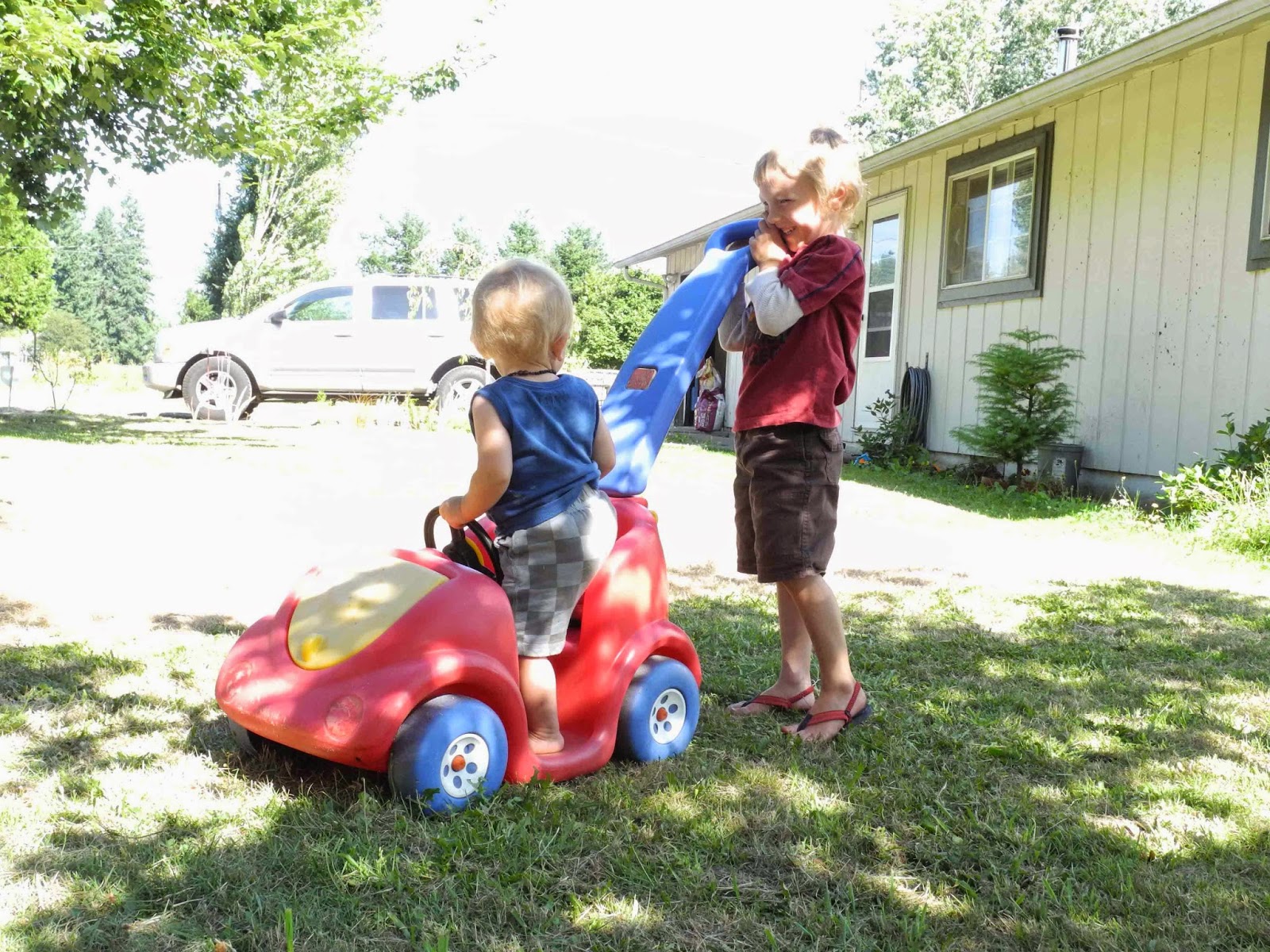 Ryker is amazing. Funny, happy, always smiling, has a little personality that keeps up with his brothers and just all around fits right in. He is walking, trying to run. He laughs at his brothers and even antagonizes them. He is so smart and is learning so many things each day. He has a couple words; mama, dada, thank you and dog. Of course I am probably the only one who understands him.